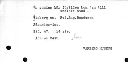 //// En söndag här förliden kom jag till //// enslöfs stad - //// finberg sn. Ref.Aug.Bondeson //// Järnvägs v is a. //// Sid. 47. 14 str. //// Acc.nr 3492 . - ////