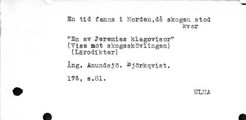 //// ^ En tid fanns i Norden,då skogen stod //// ^ kvar //// "En av Jeremias klagovisor" //// (Visa mot skogsskövlingen) //// (Lärodikter) //// & //// ! //// Ang. Ånundsja. ^jörkqvist. //// . //// 176, s.81. ////