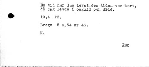 //// En tid har jag levat,den tiden var kort, //// då jag levde i oskuld och fBid. //// ^ 10,4 PE. //// i. //// Brage 5 s^54 nr 46. //// N. //// ! //// t //// ÅBO ////