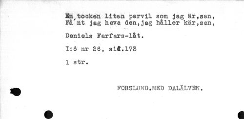 //// En^ t o oken liten parvil som jag är,san, //// Få^nt jag hava den,jag haller kär,san, //// Daniels Farfars-låt. //// * //// 4 -' //// 1:6 nr 26, sH.173 //// 1 str. //// ^ F ORSLUND.MED DALÄLVEN. ////