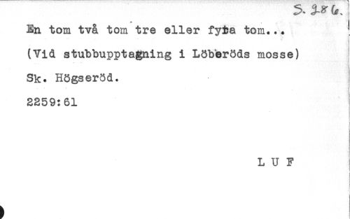//// En tom två tom tre eller fyta tom... //// ! j //// (Vid stubbupptagning i Löberöds mosse) //// - //// Sk. Högseröd. //// - < - , //// * //// 2259:61 //// L U F ////