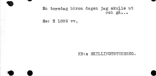 //// En torsdag härom dagen jag skulle ut //// och gå+.+ //// Se: E 1889 vv, //// KB:s SKILLINGTRYCKSREG. //// < //// ! //// ! //// t ////