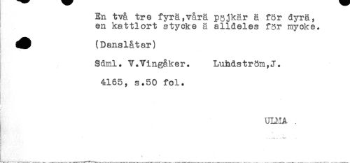 //// ! En två tre fyrä,vårä pajkär ä för dyrä, //// en kattlort stycke ä alldeles för mycke. //// ^^ (Danslåtar) //// 3dml. V.Vingåker. Luhdström,J. //// 4165, s.50 fol. //// ULMA . ////