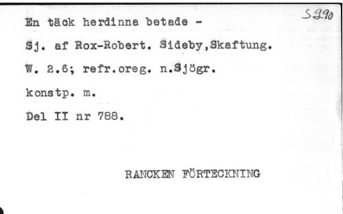 //// \ ^ y ^f A //// En täck herdinna betade - //// 3j. af Rox-Robert. Sideby,Skaftung. //// - //// W. 2.6; refr.oreg. n.Sjögr. //// konstp. m. //// Del II nr 788. //// ! //// RANCKEN FÖRTECKNING ////