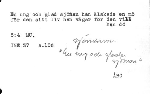 //// En ung och glad sjöman han älskade en mö //// för den sitt liv han vågar för den viåå //// han dö //// 5:4 MU. - //// INE 37 s.106 //// /