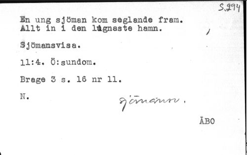 //// En ung sjöman kom seglande fram. ] //// Allt in i den l&gnaste hamn. y j //// Sjömansvisa. ] //// * i //// 11:4. 0:sundom. j //// Brage 3 s. 16 nr 11. ] //// N. ^ - ! ////