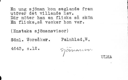 //// En ung sjöman kom seglande fram ^ //// utöver det villande hav. //// Där möter han en flicka så skön //// En flicka,så vacker hon var. //// i //// (Enstaka sjömansvisor) //// Sdml. Torsåker. Palmblad,W. //// 4643, s.12. //// ' ULMA ////
