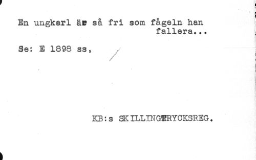 //// t ] //// En ungkarl äc så fri som fågeln han //// fallera... //// Se: E 1898 ss, //// + //// - //// t //// i //// * //// . //// KB:s SKILLINGBRYCKSREG. ////