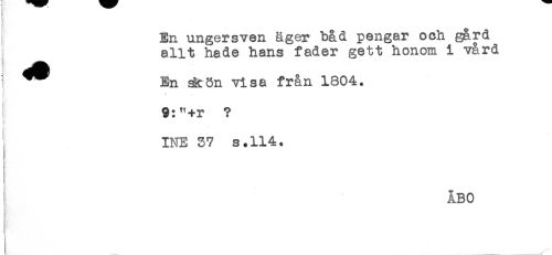 //// En ungersven äger båd pengar och gård //// allt hade hans fader gett honom i vård //// ^^ En sk8n visa från 1804. //// < -* //// 9:"+r ? //// I INE 37 s.114. //// ! ÅBO ////