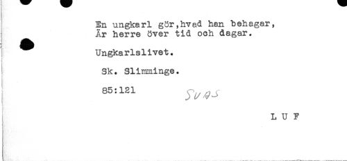 //// ) //// En ungkarl gör,hvad han behagar, //// År herre över tid och dagar. //// Ungkarlslivet. //// Sk. SliHRRinge. //// 85:121 ^^ //// L U F //// L //// ! ////