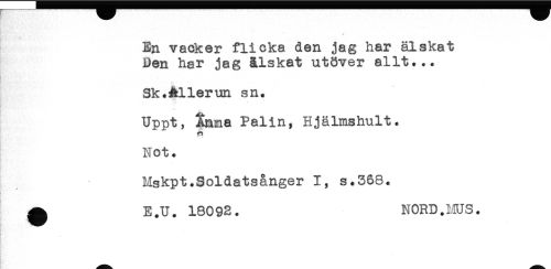 //// En vacker flicka den jag har älskat //// Den har jag älskat utöver allt... //// Sk.^llerun sn. //// ^^ * //// Uppt, Xa^a Palin, Hjälmshult. //// Not. //// Mskpt.Soldatsånger I, s.368. //// ^ E.U. 18092. NORD.HUS. //// ; ////