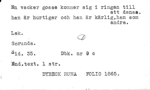 //// En vacker gosse kommer sig i ringen till //// att dansa. //// han är hurtiger och han är kärlig,han som //// andra. //// Lek. //// Sorunda. //// ^id. 35. Dbk. nr 9 c //// End.text. 1 str. //// DYBECK RUNA FOLIO 1865. ////