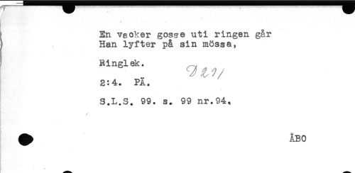 //// . - *..,. - - - //// } En vacker gosse uti ringen går //// ! Han lyfter på sin mössa, //// Ringlek. //// 2:4. PÅ. //// S.L.S. 99. s. 99 nr.94. //// !. ' //// . ////