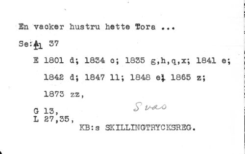 //// En vacker hustru hette Tora ... //// Se:^i 37 //// E 1801 d; 1834 c; 1835 g,h,q,x; 1841 e; [ //// 1842 d; 1847 11; 1848 e^. 1865 z; [ //// 1875 zz, ! //// G 13, ^^ //// L 27,55, //// KB:s SKILLINGTRYCKSREG. ////