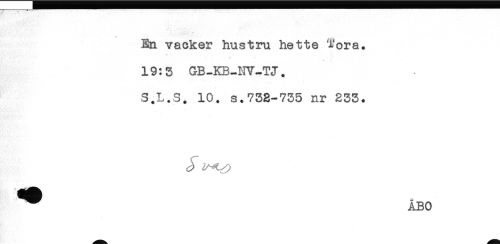 //// 't. ' //// " - ' * ** //// En vacker hustru hette Tora. //// 19:3 GB-KB-NY-TJ. //// S.L.3. 10. s.732-735 nr 233. //// ^ ÅBO ////