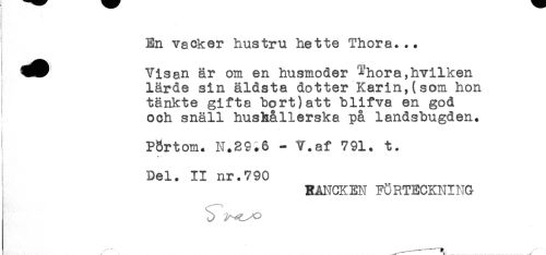 //// En vacker hustru hette Thora*.. //// ^^ Visan är om en husmoder Thora,hvilken //// lärde sin äldsta dotter Karin,(som hon //// tänkte gifta bort)att blifva en god //// och snäll hushållerska på landsbugden. //// P8rtom. N+29+6 - V.af 791. t. //// & - //// Del. II nr.790 //// EANCKEN FÖRTECKNING //// / i ... .. .... ....... .. .V ////