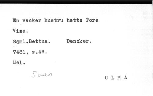 //// En vacker hustru hette Tora //// Visa. //// Sdml.Be 11na. Den ck er. //// 7481, s.46. //// Mel. //// ^ ^ U L M A ////
