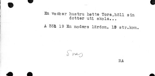 //// En vacker hustru hette Tora,höll sin //// dotter uti skola... //// ! //// Å 35t 19 En moders lärdom. 15 str.kom. //// K. //// t-' //// r* * //// RA ////