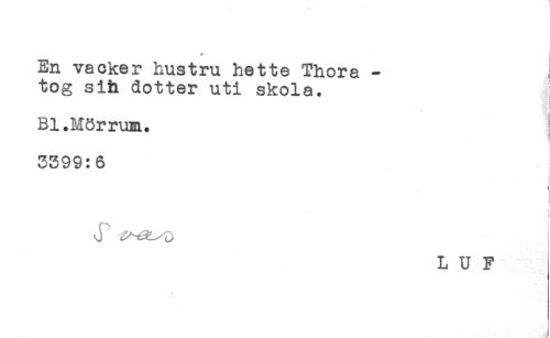 //// En vacker hustru hette Thora - i //// tog sih dotter uti skola. //// < //// Bl.Mörrum. //// i //// 3399:6 //// 1 //// J //// L U F ////