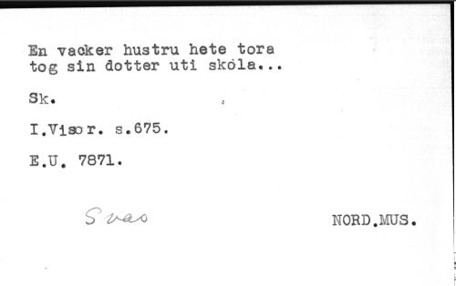 //// En vacker hustru hete tora //// tog sin dotter uti skola... //// Sk. //// 1.Visor, s.675. //// E.U. 7871. //// b" ^^o NORD.MUS. //// r- //// L //// E //// P ////