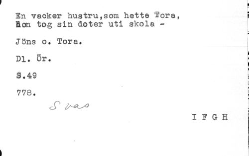 //// En vacker hustru,som hette Tora, ! //// Ron tog sin doter uti skola - //// Jöns o. Tora. //// Dl. Or. ' //// ) //// S.49 ! //// 778. //// I F G H ////
