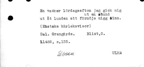 //// En vacker lördagsafton jag gick mig //// ut en stund //// ^ ut åt lunden att förnöja migg åinn. //// i //// t //// (Ehstaka kärleksvisor) //// Dal. Grangärde. Blixt,0. //// 11482, s.135. //// n //// ! ^^ ^^ ////