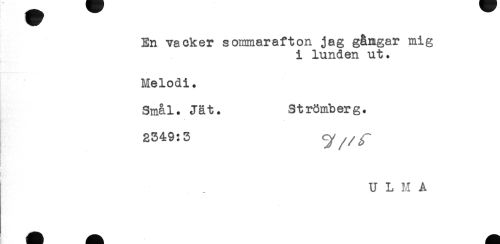 //// En vacker sommarafton jag gångar mig //// i lunden ut. //// Melodi. //// Smal. Jät. Strömberg. //// 2349:3 //// i //// U L M A ////