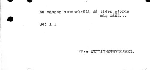 //// En vacker sommarkväll då tiden gjords //// mig lång..* //// ^ Se: I 1 //// 1 ' //// KB:s SKILLINGTRYCKSREG. //// f //// V //// ^----. ////