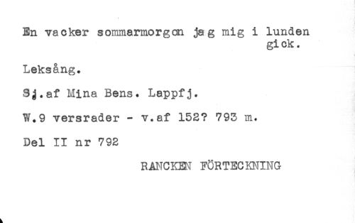 //// En vacker sommarmorgon jag mig i lunden //// gick. //// Leksång. //// Sj.af Mina Bens. Lappfj. //// W.9 versrader - v.af 152? 793 m. //// Del II nr 792 //// RANCKEN FÖRTECKNING ////