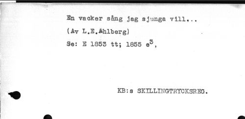 //// En vacker sång jag sjunga vill... //// (Av L.E.Ahlberg) //// Se: E 1853 tt; 1855 e^, //// ! //// ! //// !. ^^ KB:s SKILLINGTRYCKSREG. ////