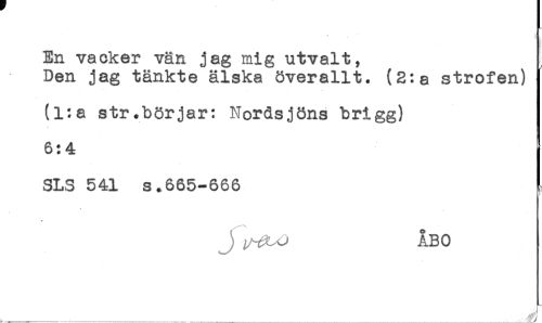 //// En vacker vän jag mig utvalt, //// Den jag tänkte älska överallt. (2:a strofen) //// (l:a str.börjar: Nordsjöns brigg) //// 6:4 //// SLS 541 s.665-666 //// ÅBO ////