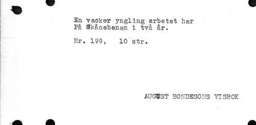 //// T]]]!])); //// i En vacker yngling arbetat har //// På Skånebanan i två år. //// Nr. 199, 10 str. //// . //// r //// is //// $ //// v //// * //// AUGUST BONDESONS VISBOK ////