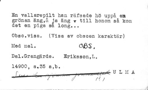 //// En vallarepilt han räfsade hö uppå em //// grönan äng,å ^a äng T till honom så kom //// det en piga sa long... //// Obso.visa. (Visa av obscen karaktär) //// Med mel. 0^6$, //// Dal.Grangärde. Eriksson,L. //// 14900, s.35 a,b. ////