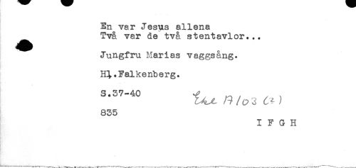 //// En var Jesus allena //// ^^ Två var de två stentavlor... //// Jungfru Marias vaggsång. //// m. Falkenberg. //// S.37-40 ^ ^ . , . //// 835 //// I F G H //// - //// R* ////