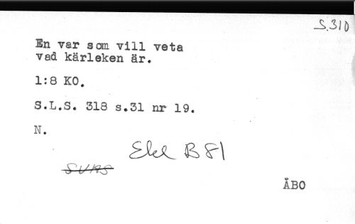 //// En var som vill veta //// vad kärleken är. //// 1:8 KO. //// S.L.S. 318 s.31 nr 19. //// N. //// ÅBO ////
