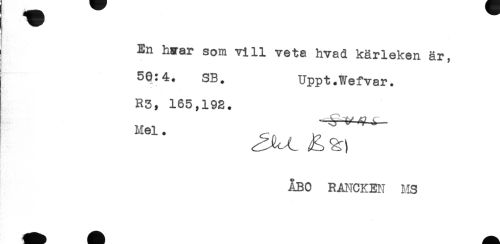 //// En hvar som vill veta hvad kärleken är, //// SO:4. SB. Uppt.Wefvar. //// R3, 165,192. //// ÅBO RANCKEN MS ////