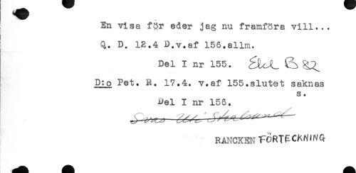//// En visa för eder jag nu framföra vill... //// . //// Q. D. 12.4 D.v.af 156.allm. //// Del I nr 155. & //// D:o Pet. R. 17.4. v.af 155.slutet saknas //// s. //// Del I nr 156. //// RANCKENfWW^'5 ////