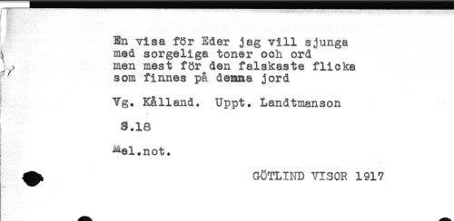 //// f ? //// 1' A'" //// 3 ^ -. ' . - //// . //// En visa för Eder jag vill sjunga //// ^ med sorgeliga toner och ord //// j . men mest för den falskaste flicka //// i som finnes på demma jord //// ! Vg. Kålland. Uppt. Landtmanson //// 3.18 //// ^el.not. //// ^ GÖTLIND VISOR 1917 ////