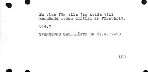 //// En visa för alla jag kväda vill //// kanhändq. mödan därtill är försp&lld, //// 8:4.? //// SVENSSONS SAML.HÄFTE NR 51.s.89-90 //// ÅBO ////