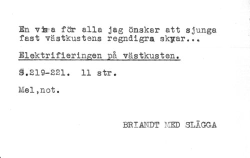 //// < //// En vjsa för alla jag önskar att sjunga //// fast västkustens regndigra skyar... //// Elektrifieringen på västkusten. //// S.219-221. 11 str. //// Mel,not. //// BRIANDT MED SLAGGA ////