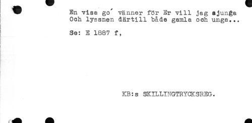 //// ^ En visa go' vänner för Er vill jag ajunga //// Och lyssnen därtill både gamla och unga... //// * //// I Se: E 1887 f, //// } //// } //// } //// KB:s SKILLINGTRYCKSREG. ////