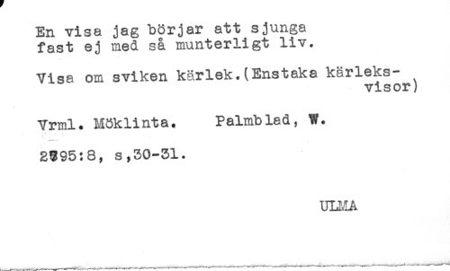 //// En visa jag börjar att sjunga //// fast ej med så munterligt liv. //// Visa om sviken kärlek.(Enstaka kärleks- //// visor) //// Yrml. Möklinta. Palmblad, W. //// * . //// 3395:8, s,50-51. //// ULMA ////