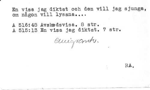 //// En visa jag diktat och den vill jag sjunga, //// om någon vill lyssna.... //// A 516:48 Avskedsvisa. 8 str. //// A 515:15 En visa jag diktat. 7 str. //// RA. ////