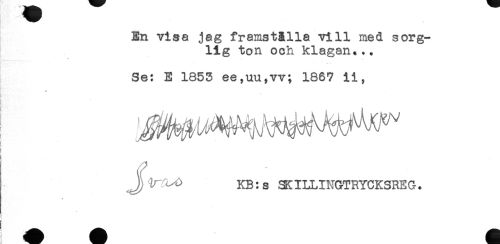 //// En visa jag framställa vill med sorg- //// lig ton och klagan... //// r*...' - ' - //// Se: E 1855 ee,uu,vv; 1867 ii, //// ^ KB:s SKILLINGTRYCKSREG. ////