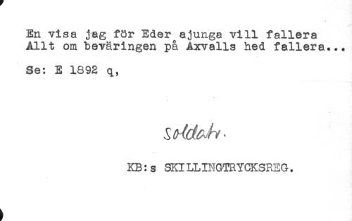 //// En visa jag för Eder ajunga vill fallera //// Allt om beväringen på Axvalls hed fallera... //// Se: E 1892 q, //// KB:s SKILLINGTRYCKSREG. //// t ////