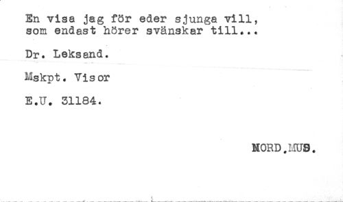 //// En visa jag för eder sjunga vill, //// som endast hörer svänskar till... //// Dr. Leksand. //// Mskpt, Visor //// E.U. 31184. //// HORD. ms. //// jt ////