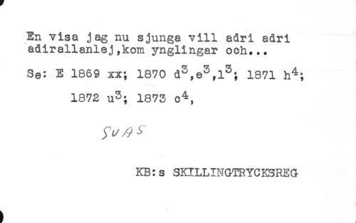 //// En visa jag nu sjunga vill adri adri //// adirallanlej,kom ynglingar och... //// '* ! //// Se: E 1869 xx; 1870 1871 h^; //// 1872 u3; 1873 c^, //// KB:s SKILLINGTRYCKSREG ////
