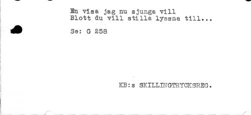 //// En visa jag nu sjunga vill //// Blott du vill stilla lyssna till... //// ! //// ^ Se: G 258 //// i //// r //// ) //// -^ //// KB: s SKILLD^GTRYCKSREG. //// : ....v"......\___r ////