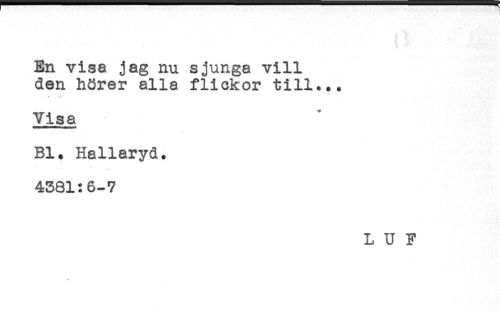 //// En visa jag nu sjunga vill //// den hörer alla flickor till... //// * //// Visa //// Bl. Hallaryd. //// 4381:6-7 //// L U F ////