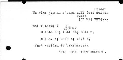 //// (tiden //// En visa jag nu sjunga vill fast sorgen //// görs) //// gör mig tung... //// Se: F Anrep d ^^ //// E 1840 hh; 1841 bb; 1844 u, //// * //// R 1837 b; 1840 o; 1876 a, //// ^ fast världen är bekymmersam //// KB: S SKILLINGTRYCK SR EG. ////